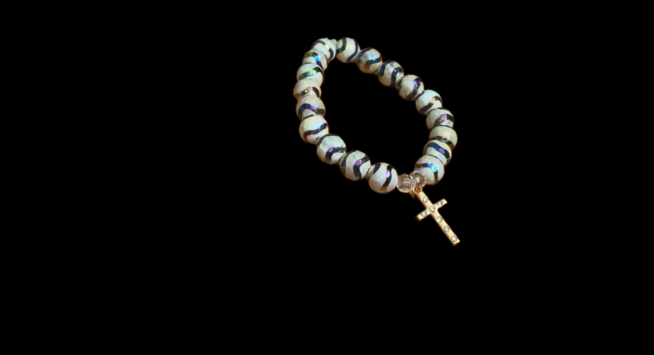 Embrace your faith with this exquisite handcrafted designer bracelet, featuring the cross and beautifully crafted. Each bracelet is meticulously made with lustrous gold rainbow stripe designer beads, offering a timeless elegance and a deep spiritual connection.